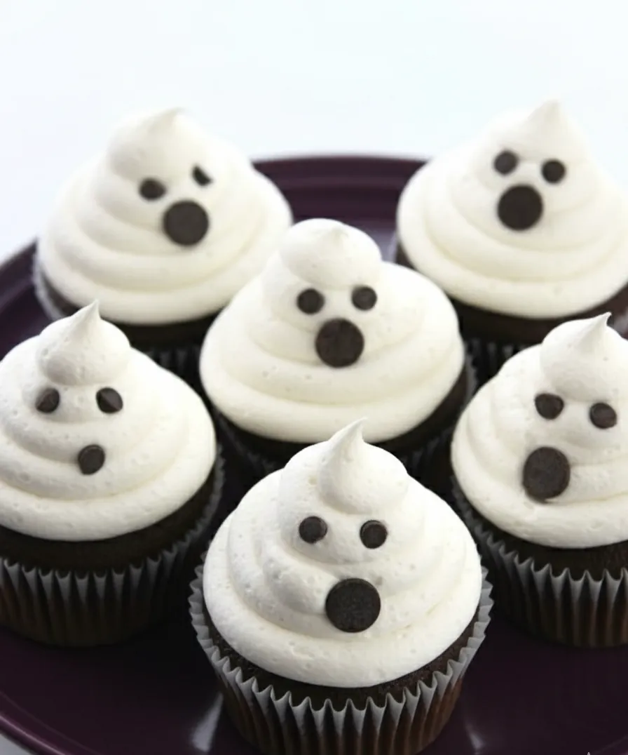 These charming ghost cupcakes are so simple, they’re almost too easy to spook people with. You start with your favorite cupcake base—vanilla or chocolate works equally well. Then, add a swirl of white buttercream frosting, and top each one with a marshmallow ghost made from melted marshmallows shaped into soft blobs. Add two little black candy eyes or dots of chocolate, and voilà: instant haunted cuteness.