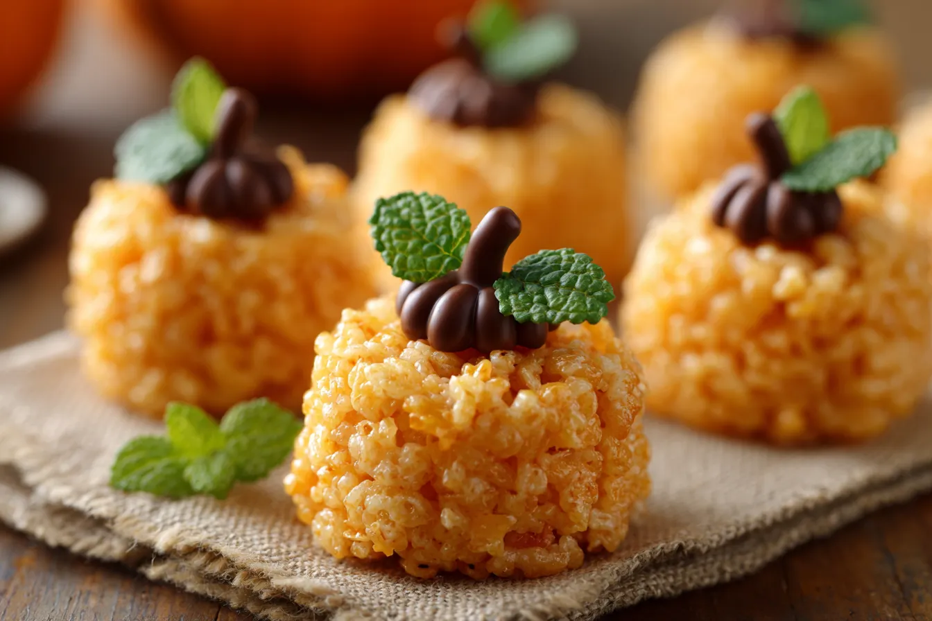 These festive little Rice Krispie treat pumpkins are as fun to shape as they are to eat. Classic marshmallow Krispies are tinted orange (with or without food coloring), rolled into balls, and topped with mini green candy stems or Tootsie Rolls.