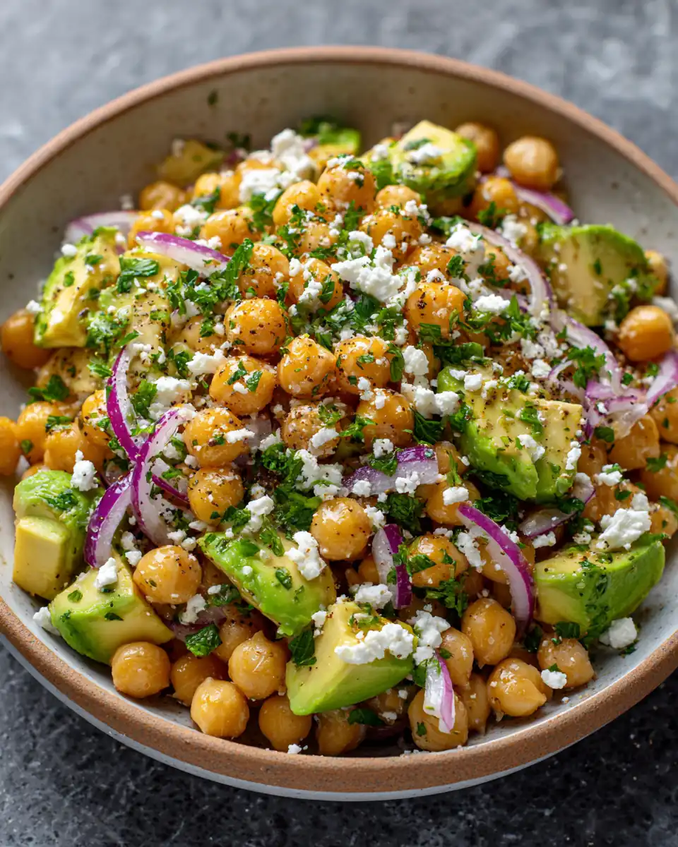 Protein-packed chickpeas, creamy avocado, and salty feta come together in this colorful salad that’s ready in minutes. It’s filling without being heavy, and the mix of textures makes it satisfying on its own. With its balance of protein, creaminess, and tang, it’s a smart choice for quick fall lunches that keep you energized all afternoon.