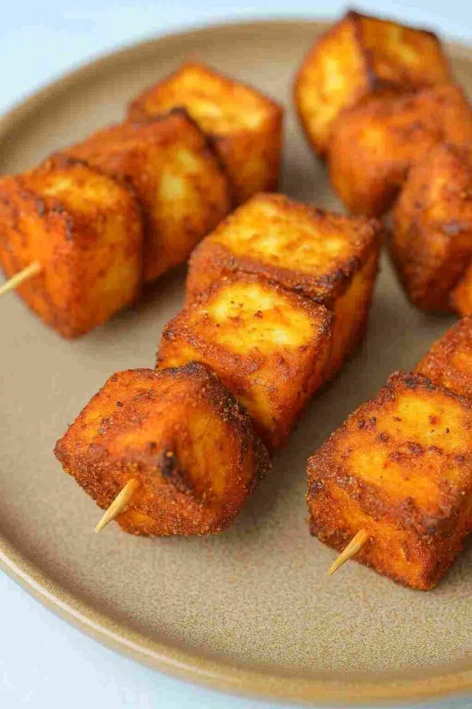 Place the seasoned paneer cubes in a single layer in the air fryer basket. Cook for 5–8 minutes, shaking the basket halfway through, until the paneer is crispy on the outside and tender inside.