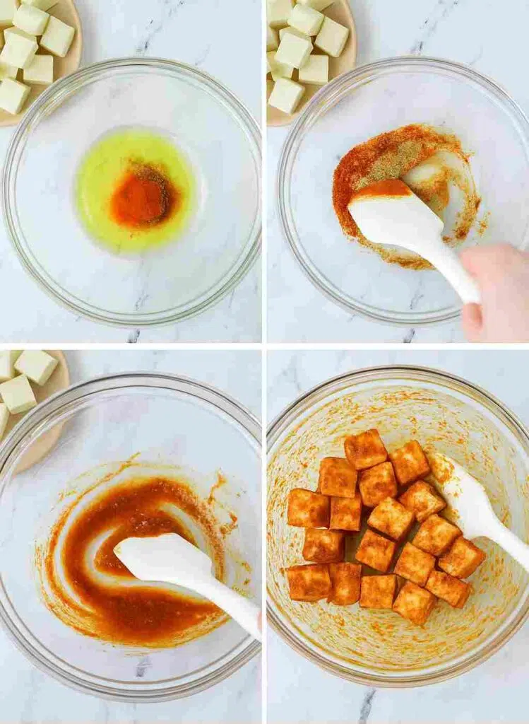 Add paneer cubes to the bowl and toss until evenly coated with the seasoning paste.
