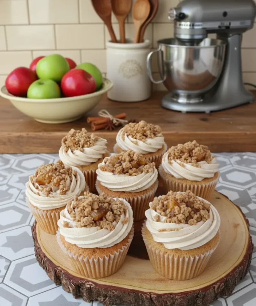 They combine spiced sponge cake, stewed apple filling, cinnamon buttercream, and a buttery crumble topping—bringing together the flavors of apple pie and crumble in cupcake form.