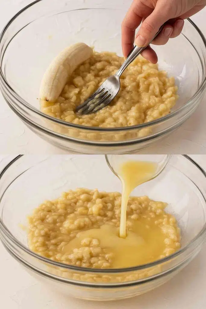 - Mix Wet Ingredients – In a mixing bowl, combine mashed bananas, melted butter, sugar, eggs, and vanilla extract.