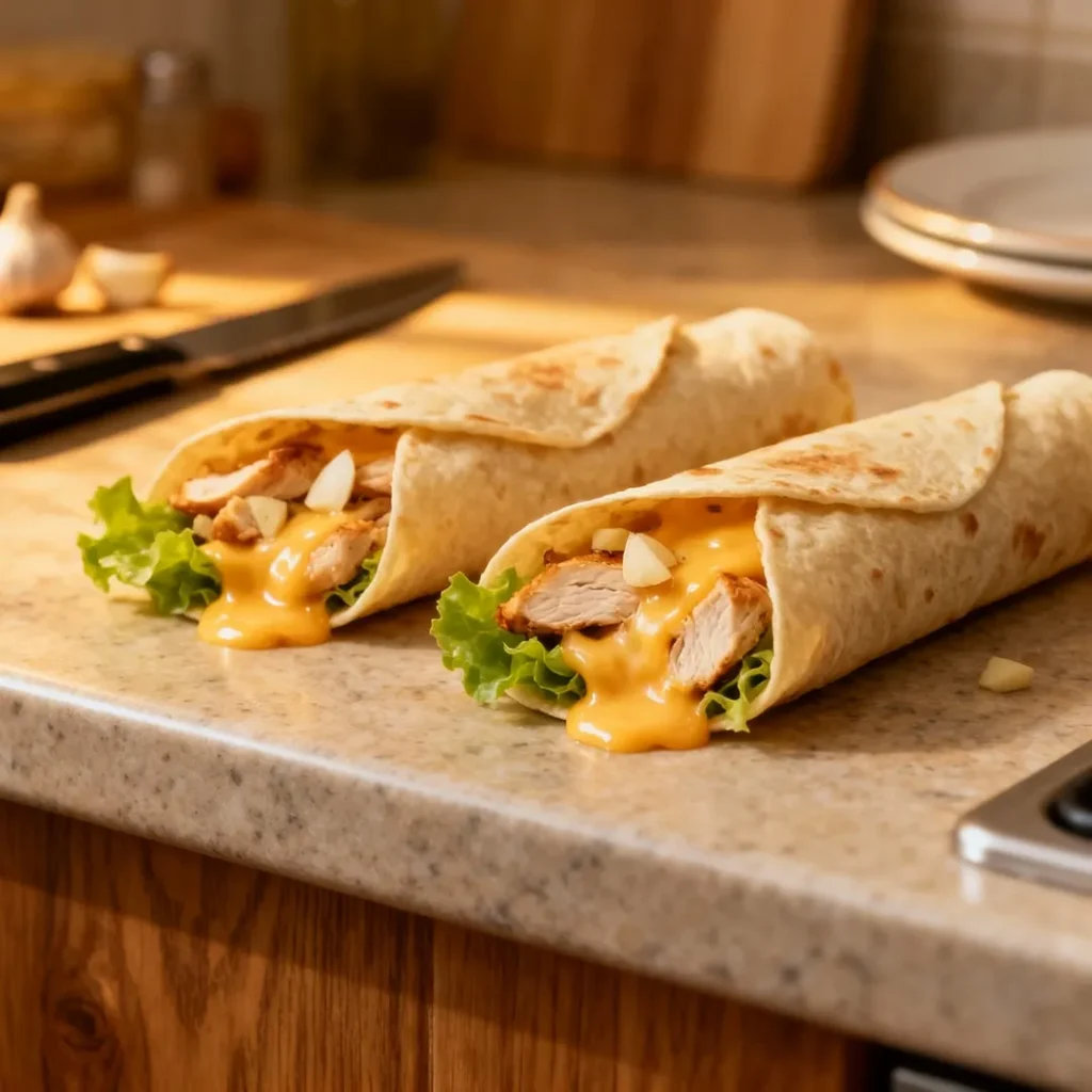 It started on a rainy evening when my fridge was nearly empty—just some leftover chicken, a few tortillas, and cheese. I didn’t feel like ordering out, and the idea of soup sounded boring. Out of impulse, I chopped the chicken, added some minced garlic, and stirred it into mayo and yogurt. That first bite? A revelation. The wrap was crispy on the outside, cheesy and gooey inside, with a bold kick of garlic in every bite. I’ve been making them ever since.