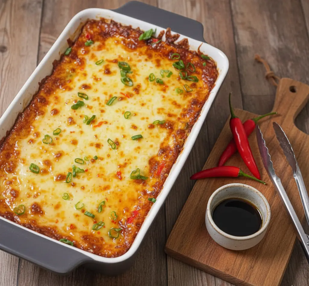 A triple cheese blend of mozzarella, white cheddar, and parmesan keeps every bite gooey with just the right pull. Once baked, the top turns golden and bubbly, offering a contrast to the creamy inside. And just when you think it can’t get better, a drizzle of sweet chili sauce and a sprinkle of scallions gives the whole dish a fresh, tangy snap.