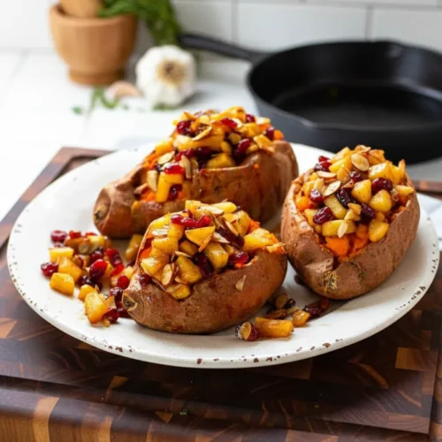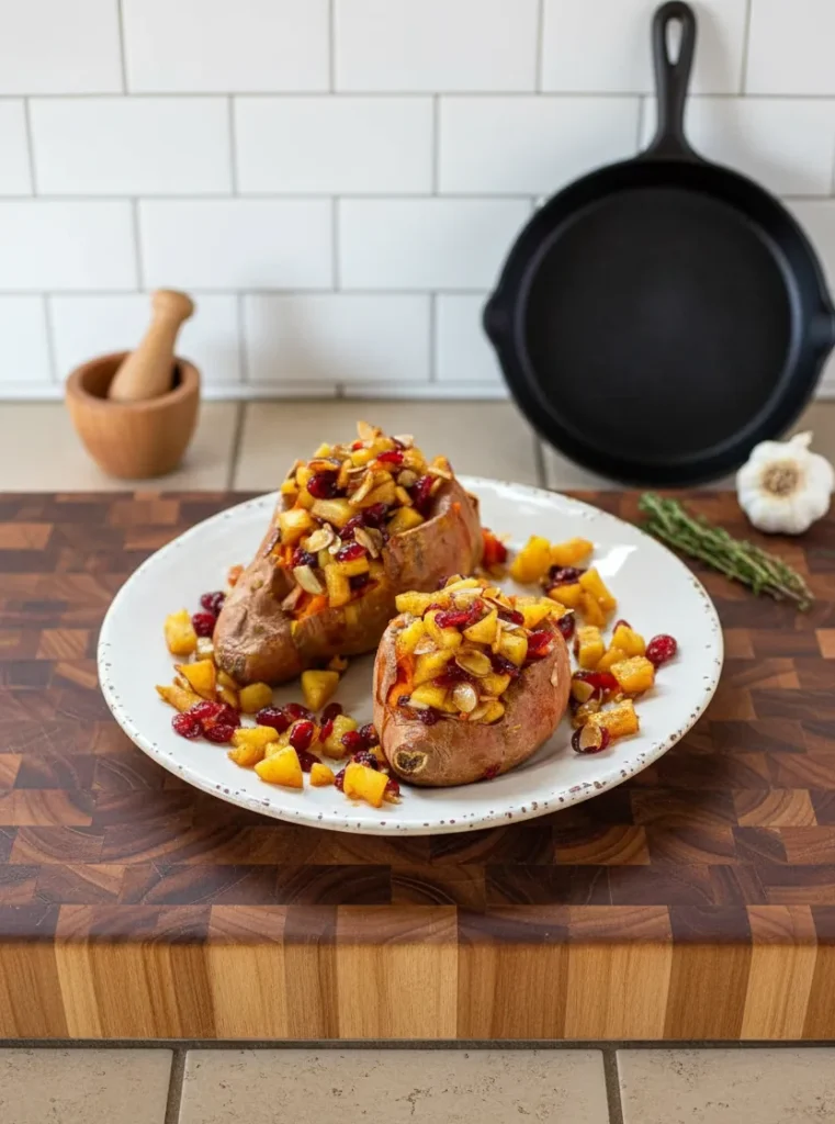 This dish was born out of a desire to bring something fresh to a Thanksgiving table full of repeats. Sweet potatoes were on the menu—as always—but instead of making the same mash or casserole, the idea came: what if the sweet potato acted like a vessel? A twice-baked shell, filled with spiced fruit, just like a baked dessert, but served as a side?
