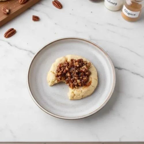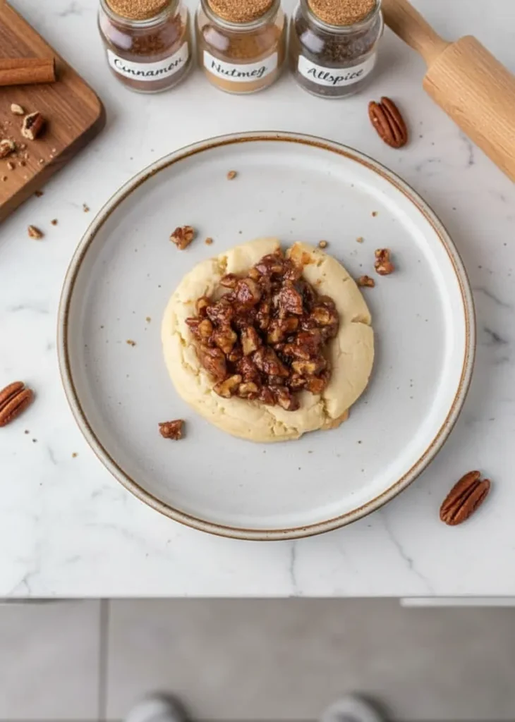Now let’s talk about that glorious pecan filling. It’s not just chopped pecans thrown on top—it’s cooked low and slow in a mix of butter, brown sugar, and cream until it thickens into a glossy, pie-like topping. Cinnamon and nutmeg bring warmth, and a splash of vanilla ties everything together. This isn’t just a topping—it’s the heart of the cookie.