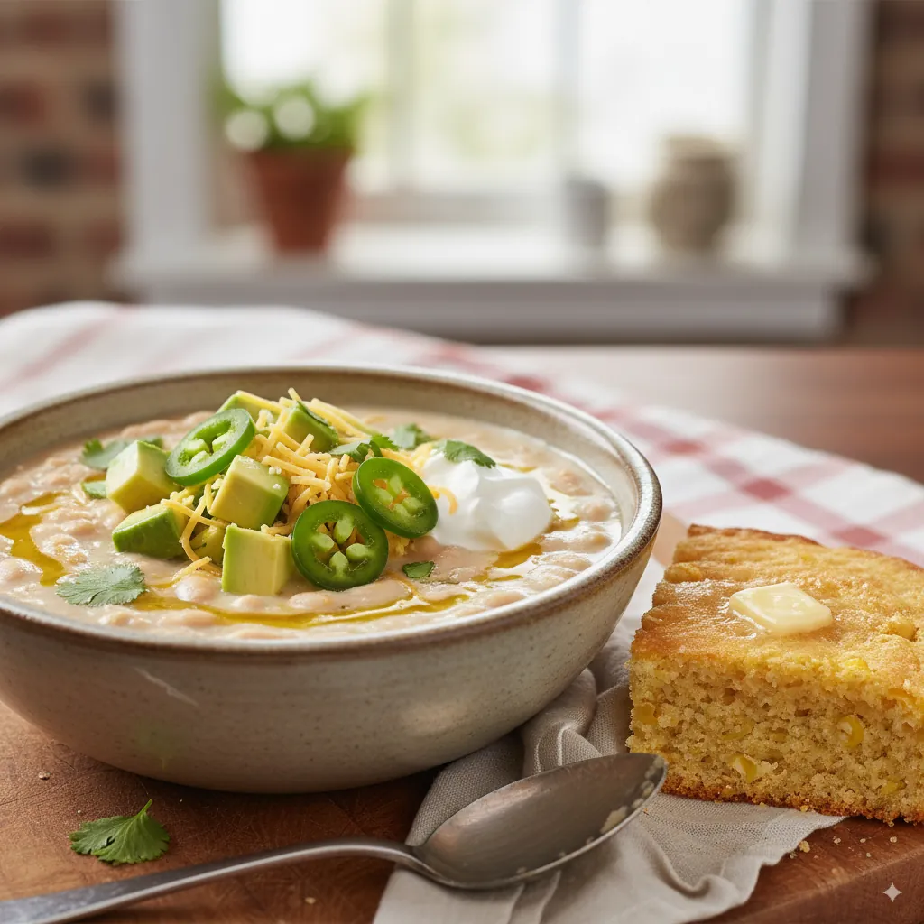 Serve Easy, Instant Pot Creamy White Chicken Chili in bowls with optional toppings to match the occasion. Fresh avocado slices, chopped cilantro, or diced jalapeños add freshness. Shredded cheese or sour cream increases richness. Salsa verde pairs well with the creamy base and adds tang. For texture, sprinkle crushed tortilla chips or serve cornbread on the side.