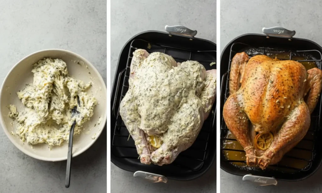 Start by letting your turkey come to room temperature for about an hour. This helps it roast evenly. While that’s happening, let the butter soften and gather your herbs. Remove the giblets and neck from the cavity (usually tucked inside), then pat the bird dry with paper towels. Dry skin equals crisp skin. Season it generously with salt and pepper, both inside and out—don’t be shy here. Stuff the cavity with halved lemon, fresh sage, thyme, rosemary, and peeled garlic cloves. These add moisture and subtle flavor from the inside as the turkey roasts.