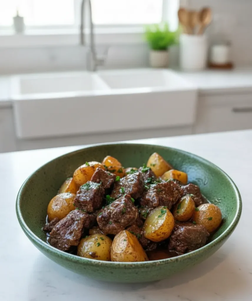 Cover with the lid and cook on low for 6–8 hours or on high for 3–4 hours. The result? Ultra-tender beef bites and buttery potatoes that soak up every ounce of flavor.