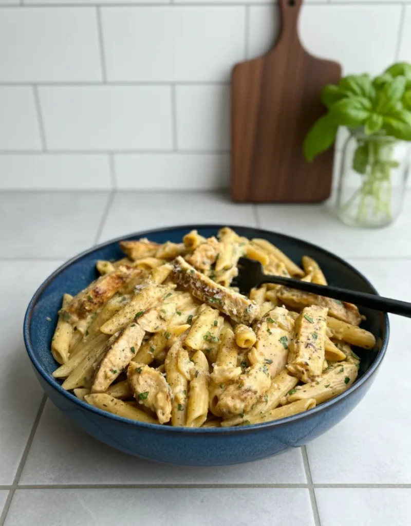 For a cozy dinner, serve it directly from the pan. It’s rustic, simple, and keeps everything warm. Use tongs to nest the pasta and chicken together on the plate, then spoon extra sauce over the top. A final sprinkle of parsley adds color and a fresh bite.