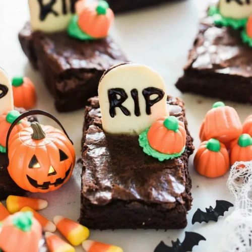 Decorating Halloween brownies is all about creativity and fun. Start with a cooled brownie base cut into squares or rectangles. Add tombstone cookies like Milanos with “RIP” written in black gel, pipe on green buttercream to look like grass, and top each piece with a candy pumpkin. You can also add gummy worms, candy eyeballs, or drizzle colored icing for extra spooky flair.