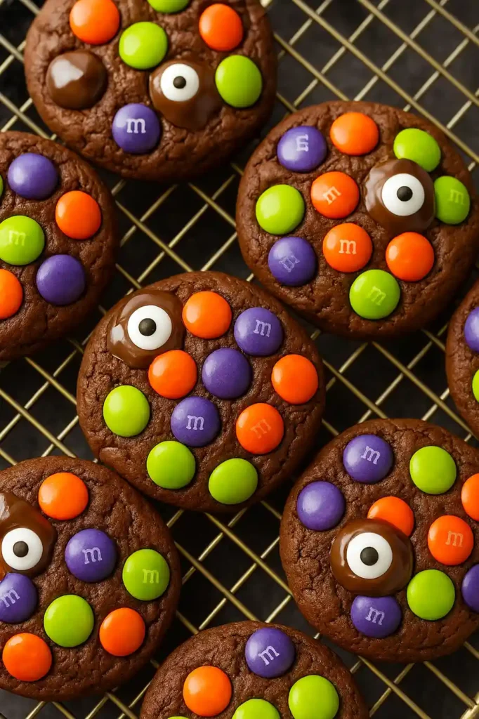 These Halloween cookies don’t need complex steps to look amazing. Press M&M’s into the tops before baking, then pop them in the freezer for 15 minutes to help them hold their shape. After baking, a quick chocolate-chip “glue” secures the candy eyes.
