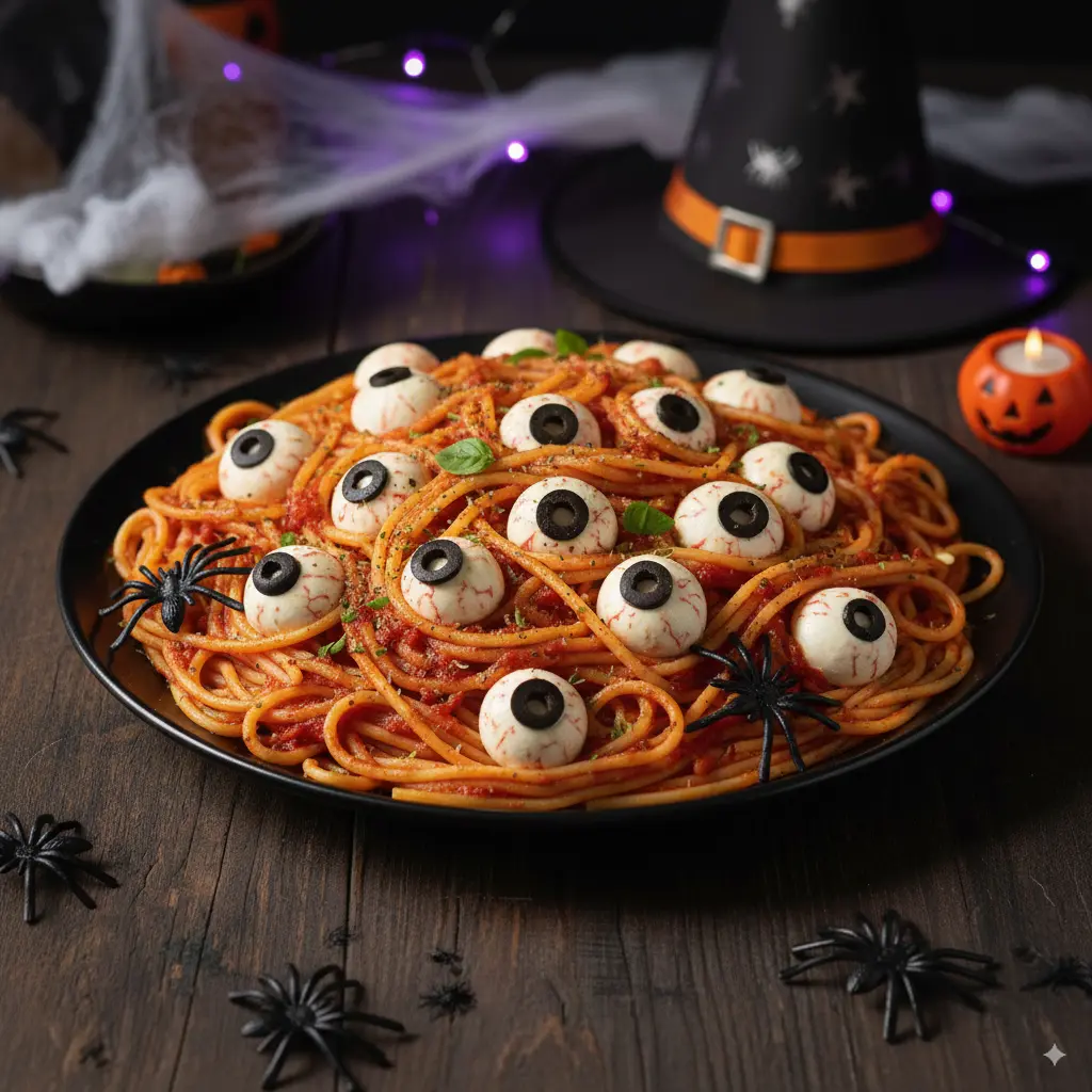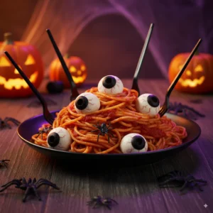 This Halloween Spaghetti recipe is more than a meal—it’s a full Halloween experience. Featuring homemade tomato sauce and mozzarella “eyeballs,” it’s festive, filling, and fun to serve. Perfect for kids and adults alike, this spooky dish looks great on a platter and tastes even better. What makes this recipe stand out is the eyeball garnish. They’re made with ciliegine mozzarella and black olives, giving every bite a ghoulish twist. You can serve it family-style or create smaller nests for individual plates. The sauce simmers with real garlic, basil, and a touch of heat for balanced flavor.