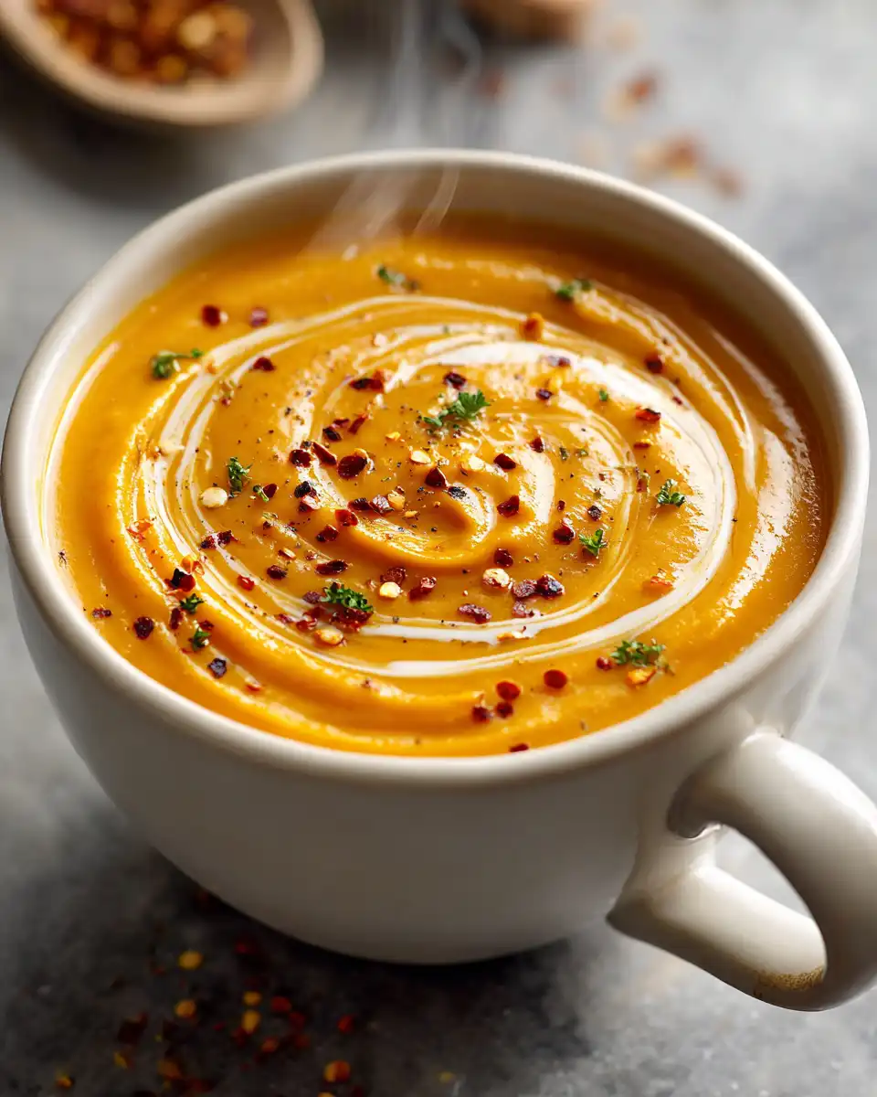 Golden and velvety, this blend of roasted butternut squash and sweet potatoes is pure comfort in a bowl—but without the heavy cream. The natural starches from the vegetables make the texture luxuriously thick, while garlic, onion, and a hint of nutmeg keep it deeply flavorful.