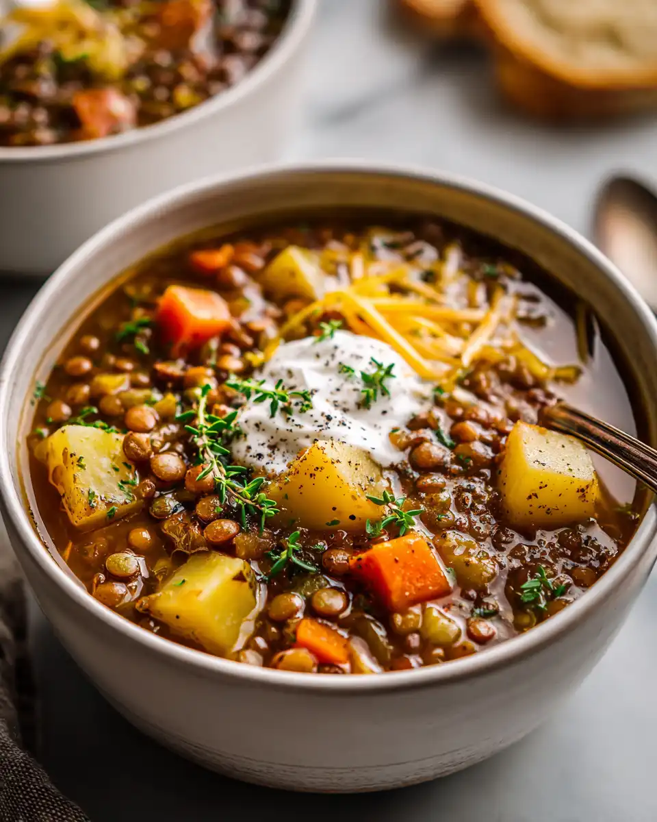 Want a vegan version? Just skip the cheese and sour cream—or blend a portion of the soup for natural richness. Lentils offer plenty of protein and fiber, making this a meal in itself that reheats like a dream.