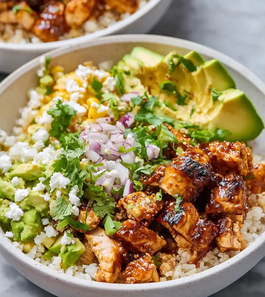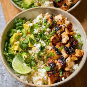 A honey chipotle chicken bowl typically includes grilled marinated chicken, rice, avocado corn salsa, and toppings like queso fresco and fresh cilantro. The marinade blends honey, chipotle peppers, lime, and spices for a sweet and smoky flavor. The salsa adds creamy texture and brightness, making this dish balanced and satisfying.