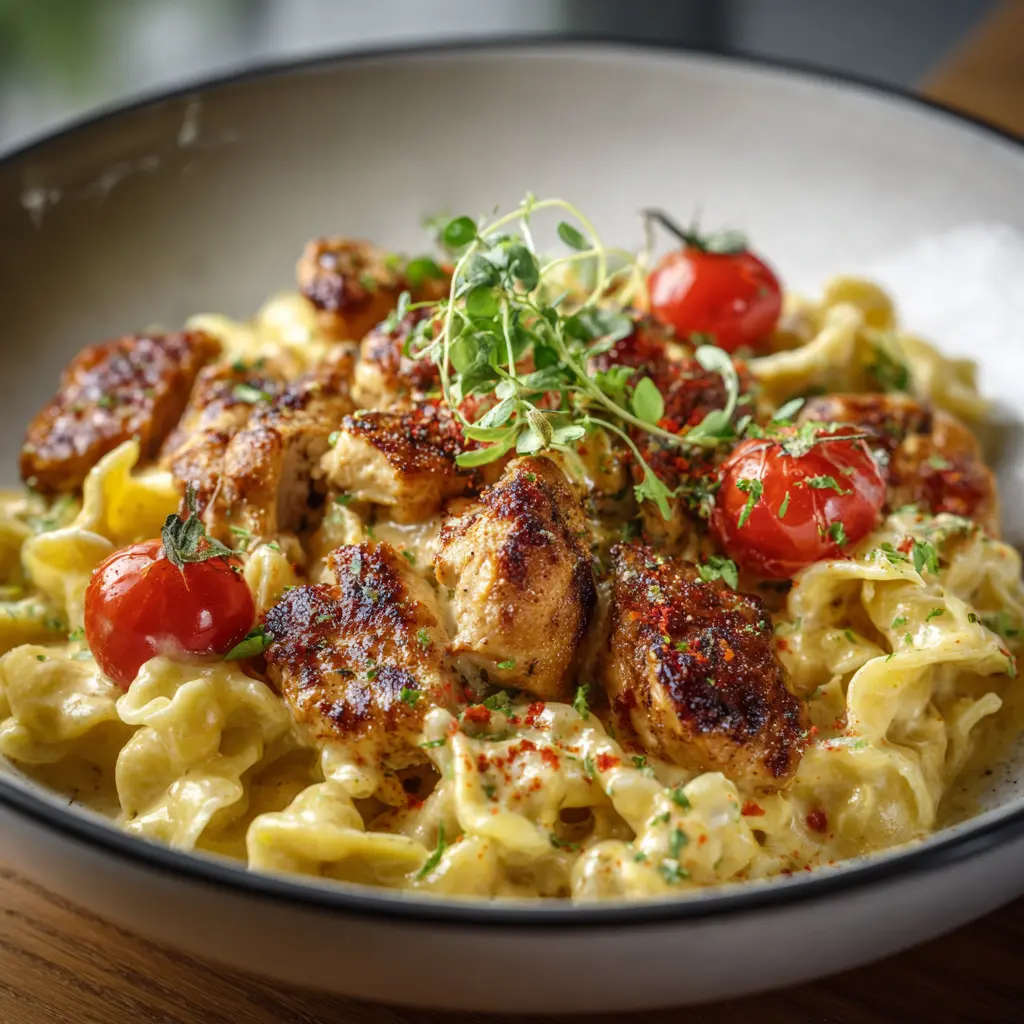 Start by cooking your pasta according to package instructions. Drain it well and set it aside while you prepare the chicken. In a skillet, heat olive oil over medium-high heat. Season the chicken lightly with salt and pepper, then sauté until golden brown on the outside and fully cooked inside—about 6–8 minutes depending on thickness.