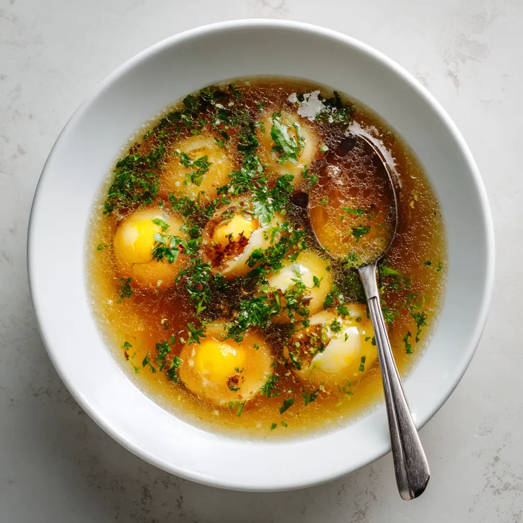 Serve immediately. The egg yolks add richness to each spoonful, blending with the broth as you eat. The soup feels complete and satisfying—without the need for cream, noodles, or added starch.