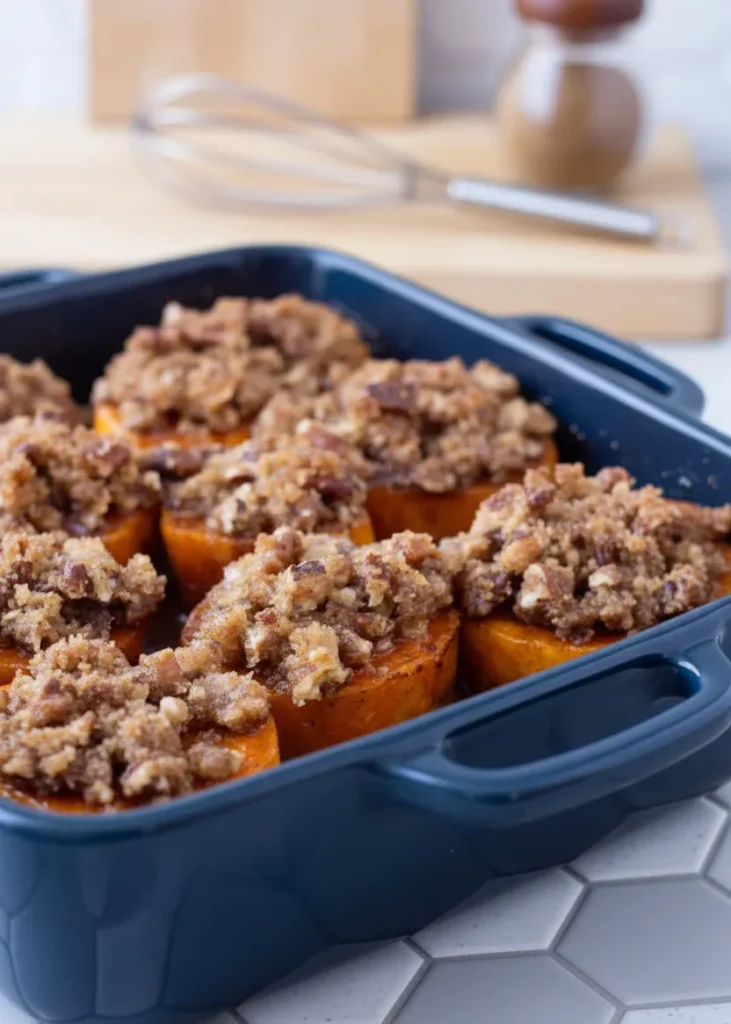 Absolutely. While the maple cinnamon sauce and pecan topping are crowd-pleasers, you can adjust them easily. Swap maple syrup for honey if that’s what you have on hand. Toasted walnuts or almonds can replace pecans. If you want a more savory finish, you can skip the crumble altogether and top the potatoes with a drizzle of browned butter and herbs like sage or rosemary.