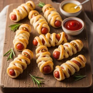 Mummy dogs are made for Halloween parties—but they’re also great for school lunches, birthday buffets, or themed movie nights. Want to go the extra mile? Turn your mummy dogs into a full “monster snack tray.” Add small cups of blood-red ketchup, green guacamole “slime,” or mustard spiderwebs for dipping.