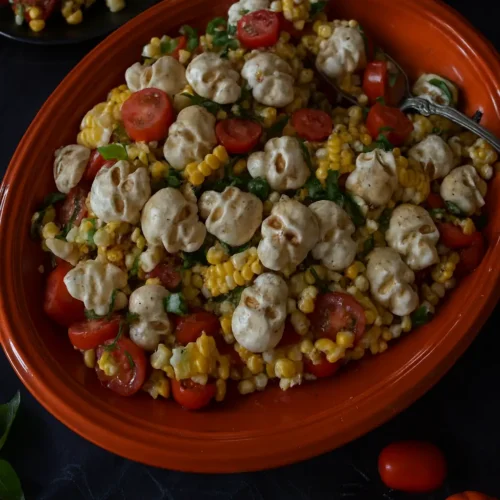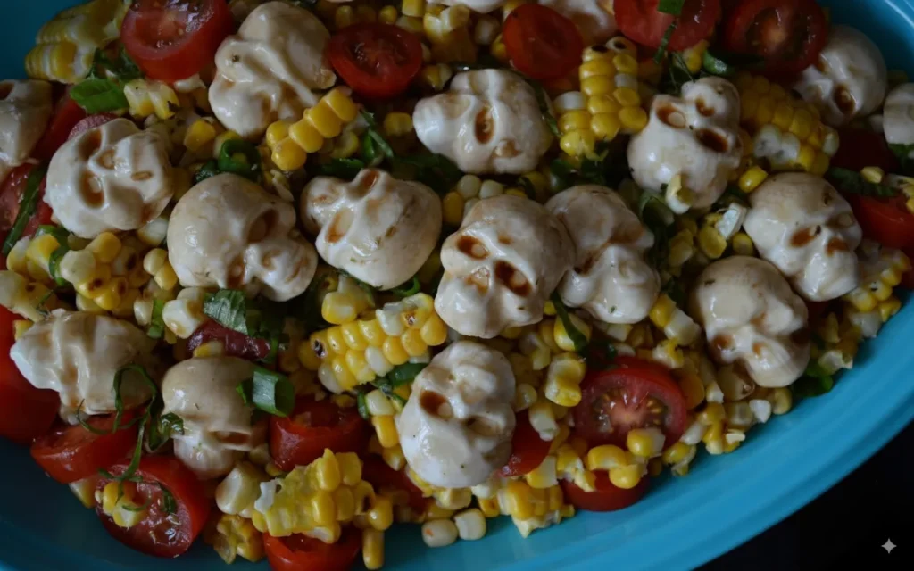 Now comes the dramatic part—add the marinated mozzarella skulls to the bowl, pouring in all the dressing they’ve been soaking in. Toss everything gently so the skulls don’t break apart. The salad should look vibrant, layered, and just a little unsettling with those skulls peeking out from beneath the corn and tomatoes.