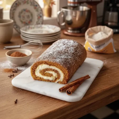A pumpkin roll cake is a thin, spiced sponge cake made with pumpkin puree and rolled around a sweet cream cheese filling. When sliced, it reveals a beautiful spiral pattern. It’s light, flavorful, and often enjoyed during fall and holiday seasons for its cozy blend of pumpkin and spices.