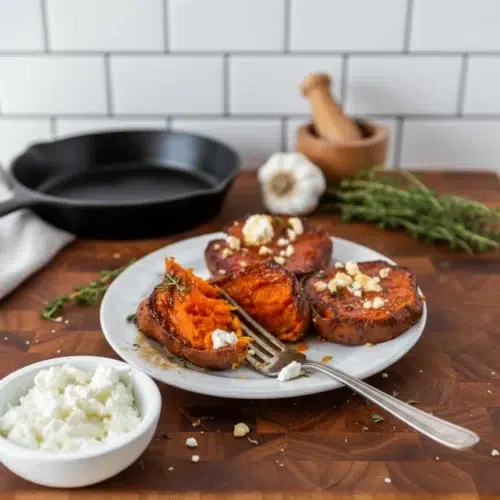 Thanksgiving is packed with rich, traditional dishes—mashed potatoes, stuffing, casseroles. But that’s exactly why roasted sweet potato rounds with honey & feta stand out. They’re bold, colorful, and bring a contrast that your plate (and palate) will appreciate. The smoky spices, creamy feta, and drizzle of honey make every bite layered and exciting. There’s no cream, no heavy sugar—just real flavor from simple ingredients.