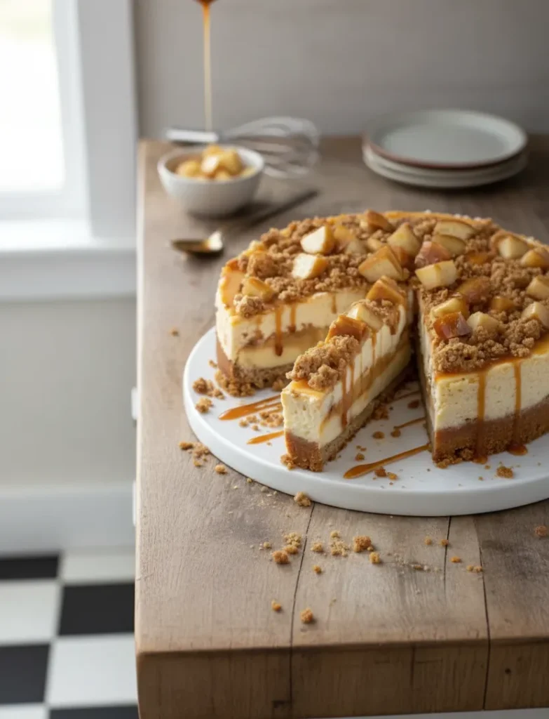 This layer not only adds texture and spice—it also helps bridge the flavors between the buttery crust and the smooth cheesecake filling. Every bite becomes a blend of crisp crust, spiced apple, tangy cream cheese, and sweet-salty caramel. It’s the kind of complexity that tastes effortless but feels luxurious.