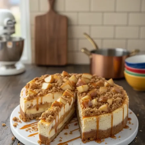 Salted caramel apple pie cheesecake brings together three timeless desserts into one unforgettable bite. With spiced apples, a buttery graham cracker crust, creamy cheesecake filling, and a drizzle of sea-salted caramel, it’s the kind of dessert that feels both nostalgic and gourmet. Whether you’re making it for a holiday dinner or just want something cozy to bake this season, this cheesecake delivers on every level—flavor, texture, and presentation. One slice, and you’ll see why this recipe belongs in your fall baking lineup.