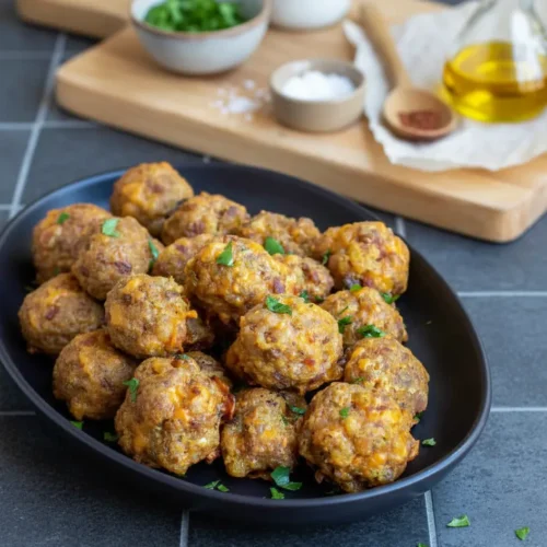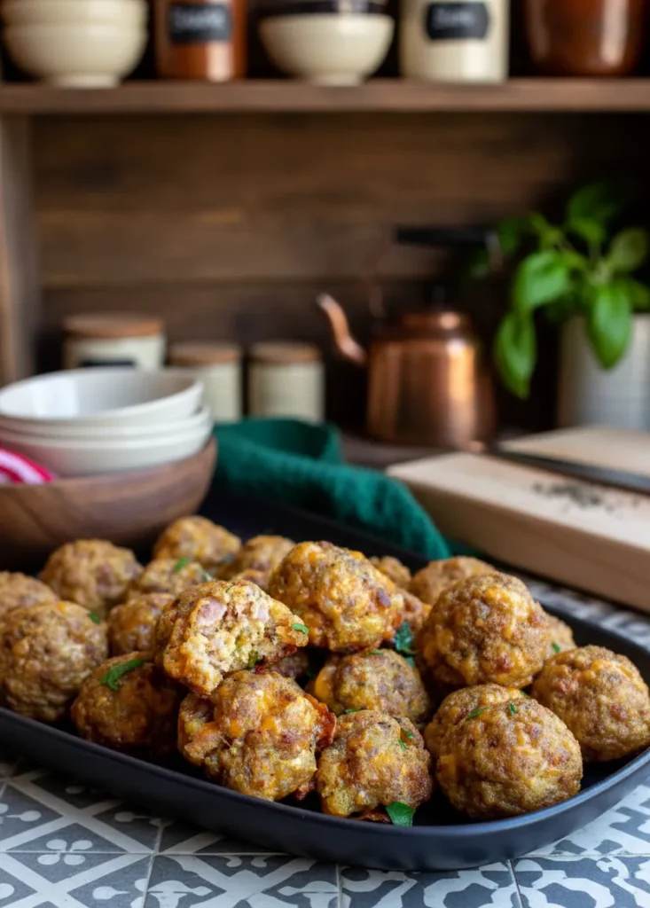 Presentation counts during the holidays. After baking, transfer your sausage stuffing balls to a festive platter or wooden board. If you’re serving them warm, keep them on a heat-safe tray and garnish with a few sprigs of fresh herbs like rosemary or thyme to give that holiday centerpiece feel.