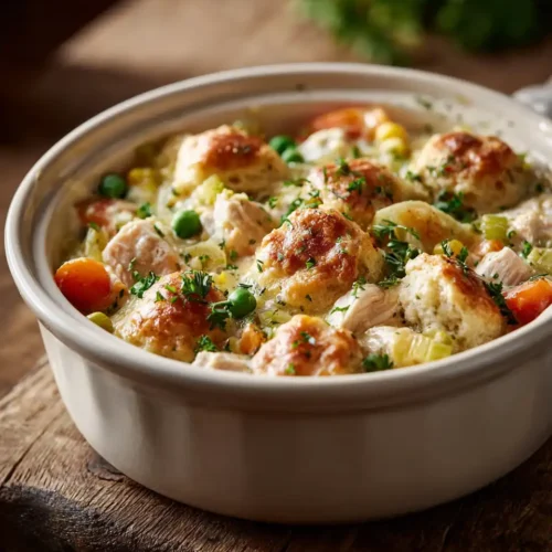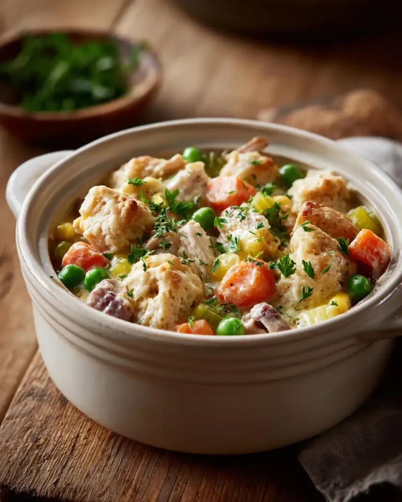 You can also serve it in wide, shallow bowls to let the biscuits sit on top like a lid—perfect for scooping and soaking up every drop. Some people prefer crumbling the biscuit right into the filling for a more “casserole-style” experience. Either way, it’s pure comfort food.