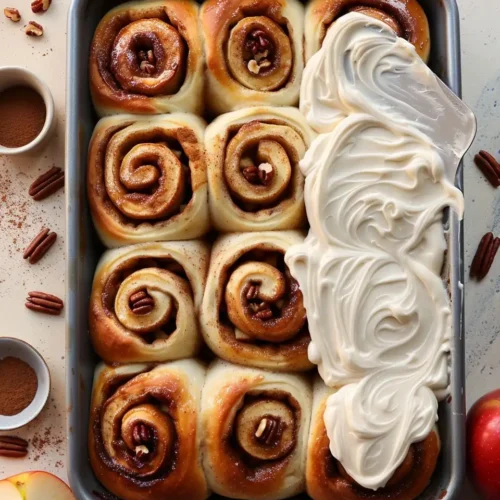 There’s something undeniably nostalgic about cinnamon rolls—especially when they’re infused with warm spiced apples and toasted pecans. These soft-baked apple cinnamon rolls aren’t just any breakfast treat—they’re the kind of gooey, pillow-soft rolls you dream of making on crisp fall mornings or lazy weekends. Packed with sweet apple pie filling, swirled with cinnamon-sugar, and topped with rich cream cheese frosting, they’re made for holiday mornings, Thanksgiving brunches, or just whenever your kitchen needs to smell like happiness. If you’re looking for a crowd-pleasing, make-ahead breakfast bake that still delivers bakery-style flavor, this recipe is for you.
