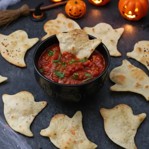 A tray of spooky baked Halloween chips is fun on its own, but the magic really happens when you add dips. The salty crunch pairs perfectly with bold, seasonal flavors. My family’s top pick is a warm bowl of pumpkin taco soup—a dip-meets-meal situation that makes the chips vanish in minutes. If you’re looking for lighter accompaniments, classic salsa and fresh guacamole are always safe bets. Their bright colors also pop beautifully against the pale golden chips, making your Halloween snack spread instantly festive.
