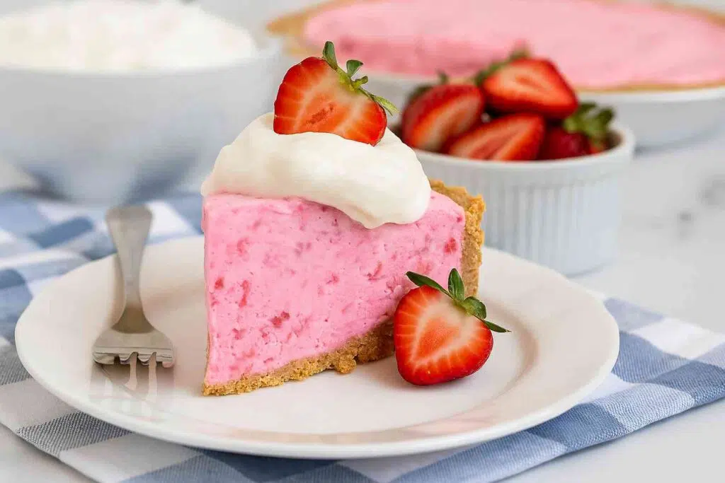 Top with fresh strawberries and whipped cream before serving. Slice and enjoy this cool, creamy treat!