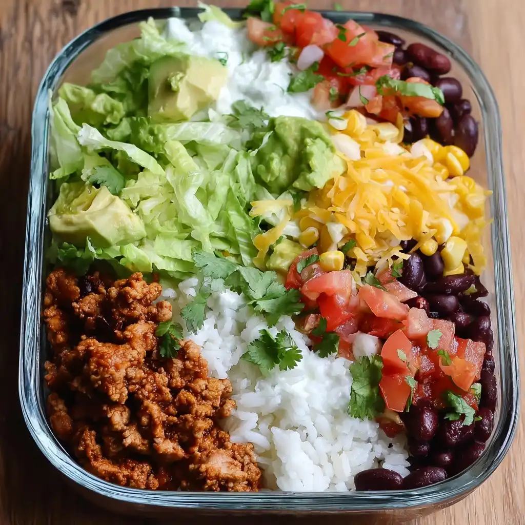 One reason these bowls work so well is because they’re highly adaptable. You can start with a base like cilantro lime rice or shredded lettuce. Then add a protein ground turkey taco meat is my favorite top with beans, corn, and whatever crunchy or creamy toppings you love. The combinations are endless, and the best part? You can prep several at once for the whole week.