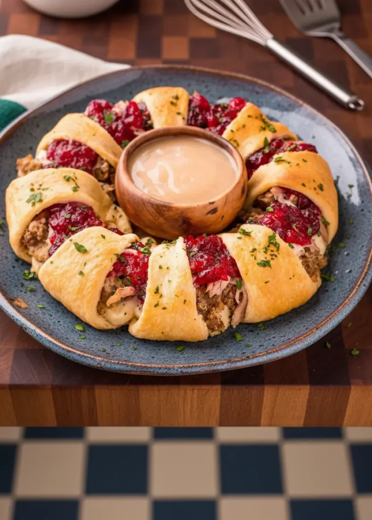 A turkey ring is a crescent roll dish shaped like a wreath and filled with classic Thanksgiving ingredients. It’s typically made with leftover turkey, mashed potatoes, stuffing, and cranberry sauce, then baked until golden and served with gravy for dipping.