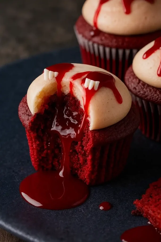 - Step 8: Final Touches 10. Arrange the decorated cupcakes on a dark serving platter, surrounded by additional red syrup drips for an extra spooky effect. The combination of the pale frosting, deep red velvet filling, and blood-like drips creates an irresistible and terrifyingly delicious treat.