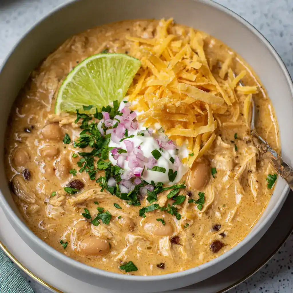 Crispy tortilla strips or crushed tortilla chips give a salty crunch that contrasts beautifully with the creamy chili. A sprinkle of shredded cheese—like Monterey Jack, Pepper Jack, or sharp cheddar—melts right into the hot bowl. Fresh diced avocado brings creaminess, while lime juice adds brightness that cuts through the richness. A handful of chopped cilantro finishes things with a fresh, herbal note.