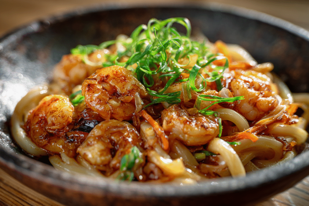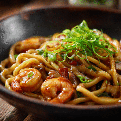 It was a Friday night, and I’d just walked in from a long day juggling work, errands, and back-to-back emails. The fridge wasn’t empty, but it wasn’t exactly inspiring either—just a few shrimp, some spring onions, mushrooms, and a pack of vacuum-sealed udon noodles hiding in the back. I remembered a dish I once saw on a Japanese travel show: Yaki Udon with Shrimp—a sizzling stir-fry of thick noodles, shrimp, and veggies glazed in a glossy sauce. That night, I gave it a try, and it instantly became a weeknight hero.